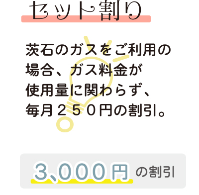 - 当社のガスを使用している場合、電気・ガスセット割を別途適用致します。但し、電気・ガスセット割には適用条件があります。
